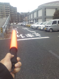 警棒で確実に駐車場の空いているところに車を誘導する、
