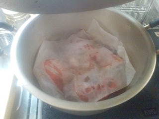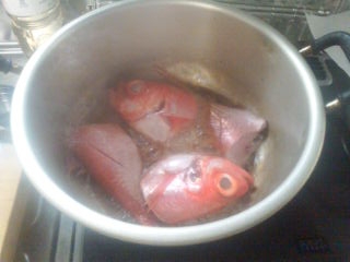 2.始めのうちはおたまで煮汁を魚にかけて様子を見る