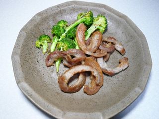 塩豚を薄く切って、焼く。ひたすら肉から出た油をペーパータオルで取り、カリカリに焼く。
