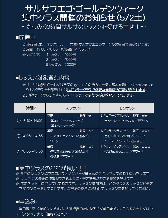 サルサフエゴ・ゴールデンウィーク集中クラス開催のお知らせ(5/2土) ~たっぷり3時間サルサのレッスンを受ける幸せ!~ 今回はパフォーマンスメンバーがレッスンのサポートをします。特に初心者やこれからサルサを初めてみたい方々へおすすめください。 ■開催日 ☆5月2日(土) はまホール35号室(サルサフエゴのサークルの名目で借りています) ☆時間: 13:00~16:00 約1時間 × 3クラス(基礎・レギュラークラス併設) ☆レッスン代 1 レッスン:1000円 2 レッスン:1500円 3 レッスン:2000円 ■レッスン対象者と内容 ☆サルサは初めて・もしくは数回の方へ : この機会に一気に基本を身につけちゃいましょう!基礎クラスであるAクラスを全部受ければ、レギュラークラスで必要な最低限の知識が得られます。 ☆レギュラークラスレベルの方へ : 踊れる方向けのクラスであるBクラスでは、たっぷりペアワークをします。 ①13:10~14:00 Aクラス 基礎 ・基本12ベーシックステップ ・基本ベーシックペア Bクラス レギュラークラスレベル ・きっちりオーソドックスなペアワーク ②14:05~14:55 Aクラス 基礎 ・これはおさえてほしい基本ペアワーク Bクラス レギュラークラスレベル ・ちょっぴりおしゃれなペアワーク ・ベーシックステップを追求する ③15:00~15:50 Aクラス 基礎 ・更に基本2ステップを加えます ・使えるペアワーク Bクラス レギュラークラスレベル ・できるとかっこいいペアワーク 当日飛び入り参加もOKですが、人数把握のためご連絡を頂けると助かります。 お名前、参加予定レッスンをご記入ください ご質問等もお受けいたします。 ☆持ち物 室内用シューズをお持ちください。 以上、楽しみましょう!※お待ちしております!