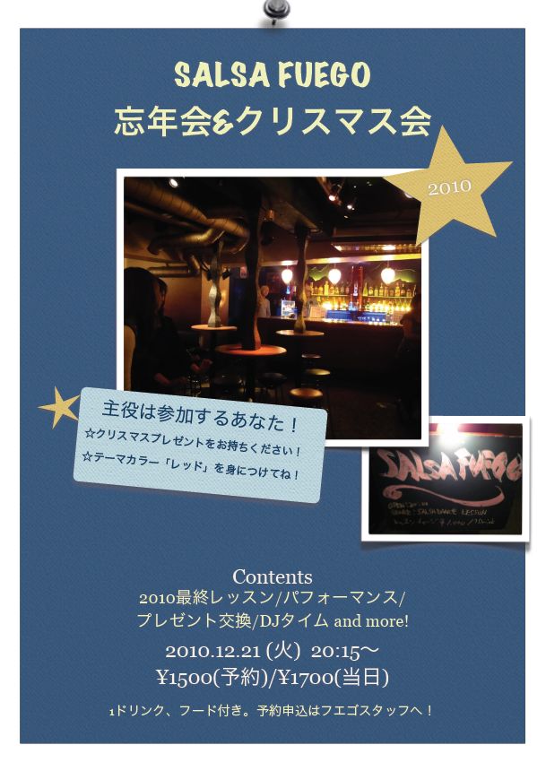 ”今年もサルサをやっててホント良かった! みんなにお疲れ様を!フエゴ忘年会&クリスマス会” TAKAです。今年も一年あっという間でしたね。今年もフエゴにきて頂き、スタッフ一同心より感謝しております。 さて、今年のテーマは、主役は参加するあなた、そして「みんなで作る忘年会」です。 今年は新しくサルサを始めた方がたくさんいます。そして、昔からきて頂いているかたも含め、一緒に浜松サルサを盛り上げ、上達していけてうれしいです。今年最後の火曜サルサフエゴで、みんなでお疲れ様を言い合いましょう! 以下、忘年会&クリスマス会の予定です。 ■月日:12月21日(火) 特別レッスン有 ■会費:予約申込1500円、当日(予約無)1700円 1ドリンク、フード付です。人数把握のため、予約申込と、なるべく事前に会費をRitzへお渡しください。 ☆予約メールはRitzへ blue-b.r5@docomo.ne.jp参加者名をご記入下さい。 入場に関して、当日は22:00まで会費制です。 ■プレゼントをお持ちくださいね クリスマスプレゼント交換をします。500~1000円程度で、プレゼントを準備ください。まだ時間はあります!もらってうれしいものを考えてくださいね。金券(相当)等、自作CD・DVD、賞味期限当日の食品などは避けて下さい。 手提げ袋など入れて持ってきてください。 ■テーマカラーは゛レッド!゛ 情熱のフエゴカラーの赤色のシャツ・ドレスなど衣装・ワンポイント・サンタ衣装など、クリスマスにちなんだ格好をしてきてください。会場で準備してもOKです!あなたが主役です! ■スケジュール: ・19:45 開場 ・20:15~20:45 今年最終レッスン(アイソレーション、ウォームアップ は、各自やっておいてください) ・20:45 忘年会開始 ・21:00 乾杯 <コンテンツ> ☆パフォビデオ上映会 ☆出し物(6組予定): 1.GDO48! 2.アヤのラブリィ・ベリーダンス! 3.セクシーピ○クレディ! 4.ヒデのヒップホップ! 5.にわくんのロック! 6.あの人がっ、パーカッシニスト! ☆21:45 プレゼント交換 ・22:00 DJ クラブタイムへ ■その他 まだまだ出し物していただける方を募集しています。また、差入れ等大歓迎です。事前にスタッフにお知らせ頂けるとうれしいです。今年の参加は50名程度を見込んでいます。![]()