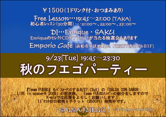 お知らせです。 サルサコンサボールK-MIXパーティの前・・・夜祭です! ○●○9/23(火・祝)は「秋のフエゴパーティー」です○●○ ☆Emporio Cafe 19:45~23:30 1500円(1ドリンク付・おつまみあり) ☆Free Lesson・・・19:45~21:00(TAKA) また30分ほどの初心者レッスン随時開催。初めてのお友達も楽しめます。 ☆DJ・・・Enriqur・SAKU EnriqueのセレクトCDやプレゼントが当たる抽選会もあります。 K-MIXパーティでパフォーマンスをする新フエゴパフォチームのメンバー紹介もします。応援よろしくおねがいしまーす。 前売りチケット販売もしますので、ぜひ遊びに来てくださいね。※サルサの秋です!